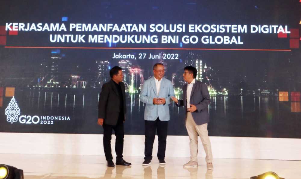 (Ki-ka) Direktur M Cash Mohammad Anis Yunianto, Direktur Utama BNI Royke Tumilaar, Direktur Utama Telkomsel Hendri Mulya Syam *berbincang - bincang usai menyaksikan Penandatanganan* Perjanjian Kerja Sama Pemanfaatan Solusi Ekosistem Digital Untuk Mendukung BNI Go Global di Menara BNI, Jakarta, Senin (27/6/2022).