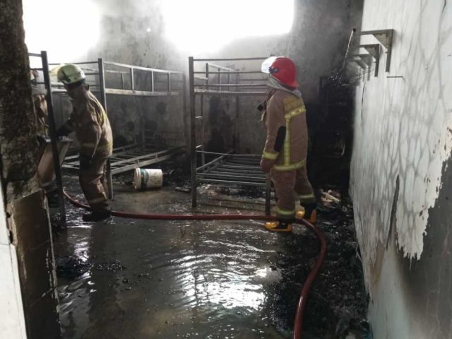TANGERANG — Pos Damkar Balaraja tangani kebakaran Pondok Pesantren Insan Pratama 2, di Kampung Tegal Ampo, RT 02 RW 02, Desa Benda, Kecamatan Sukamulya, Kabupaten Tangerang, Minggu, (26/2). Kebakaran diduga akibat korsleting listrik.