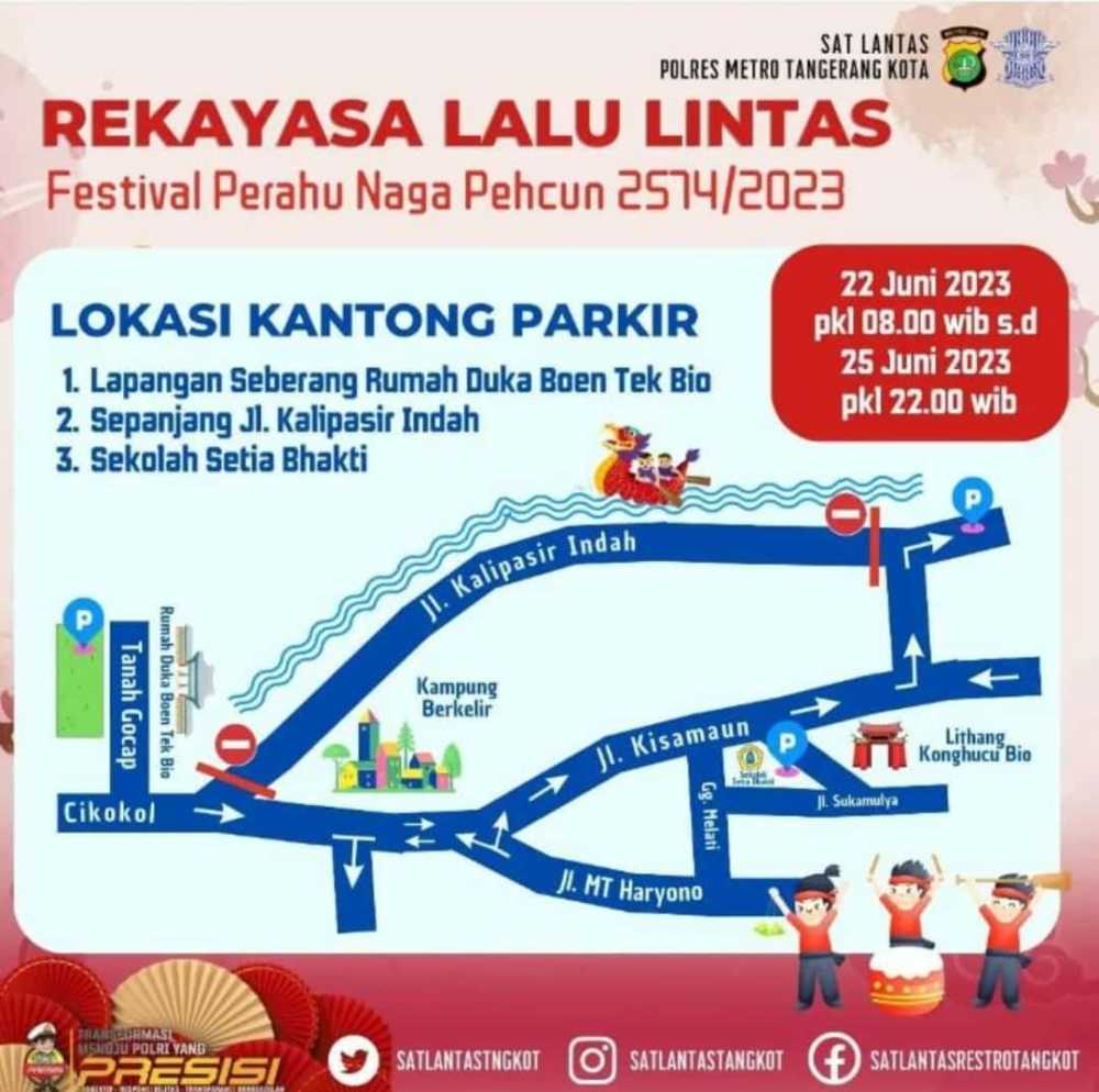 Pengendara dari arah Cikokol harus mengarahkan kendaraannya ke Jalan Kisamaun atau Jalan MT Haryono. Sementara pengunjung yang akan mengikuti rangkaian acara Festival Pehcun harus parkir di titik yang disediakan panitia seperti di lapangan depan rumah duka Boen Tek bio dan Sekolah Setia Bhakti.