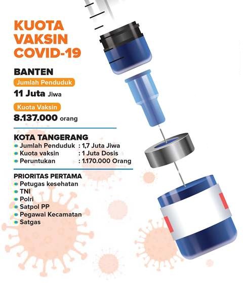 KOTA TANGERANG-Kabar baik. Pemerintah akan segera mendistribusikan vaksin untuk menangkal Covid-19. Kota Tangerang mendapatkan kuota 1 juta dosis dari Pemprov Banten. Vaksin sebanyak itu untuk memvaksin 1.170.000 orang dari total jumlah penduduk Kota Tangerang 1,7 juta jiwa. Namun, pada tahap pertama akan diberikan bagi 3.000 orang yang masuk dalam kelompok prioritas, pada Desember mendatang.