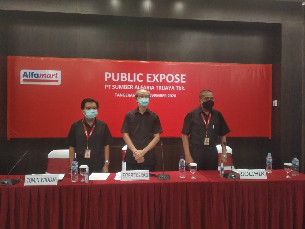 Dari kiri : Corporate Secretary PT Sumber Alfaria Trijaya Tbk Tomin Widian, Direktu Franchise Soeng Peter Soeryadi, Corporate Affairs Director, Solihin berpose bersama usai memaparkan public expose. Foto : Abdul Aziz/Tangerang Ekspres