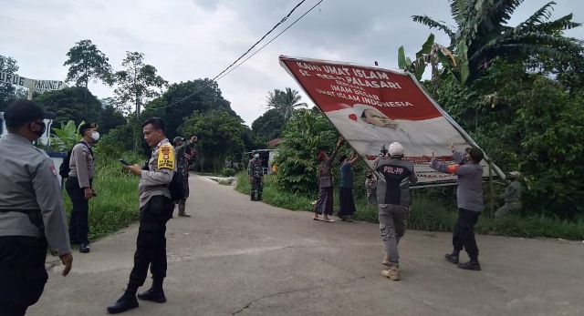 TIGARAKSA – Puluhan baliho maupun spanduk bergambarkan Rizieq Shihab diturunkan petugas gabungan Satpol PP, TNI dan Polri di Kabupaten Tangerang. Perintah penurunan spanduk maupun baliho dikarenakan pemasangan tersebut diduga tidak memiliki izin dari pemerintah daerah (Pemda).