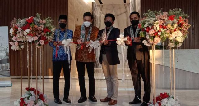 CEO Azana Hotel & Resort, Dicky Sumarsono (kemeja batik cokelat) bersama GM Azana Style Hotel Jakarta, Yudhi Meidiyanto memotong pita sebagai tanda Azana Style Hotel Jakarta Resmi dibuka, Senin (18/4/2022).