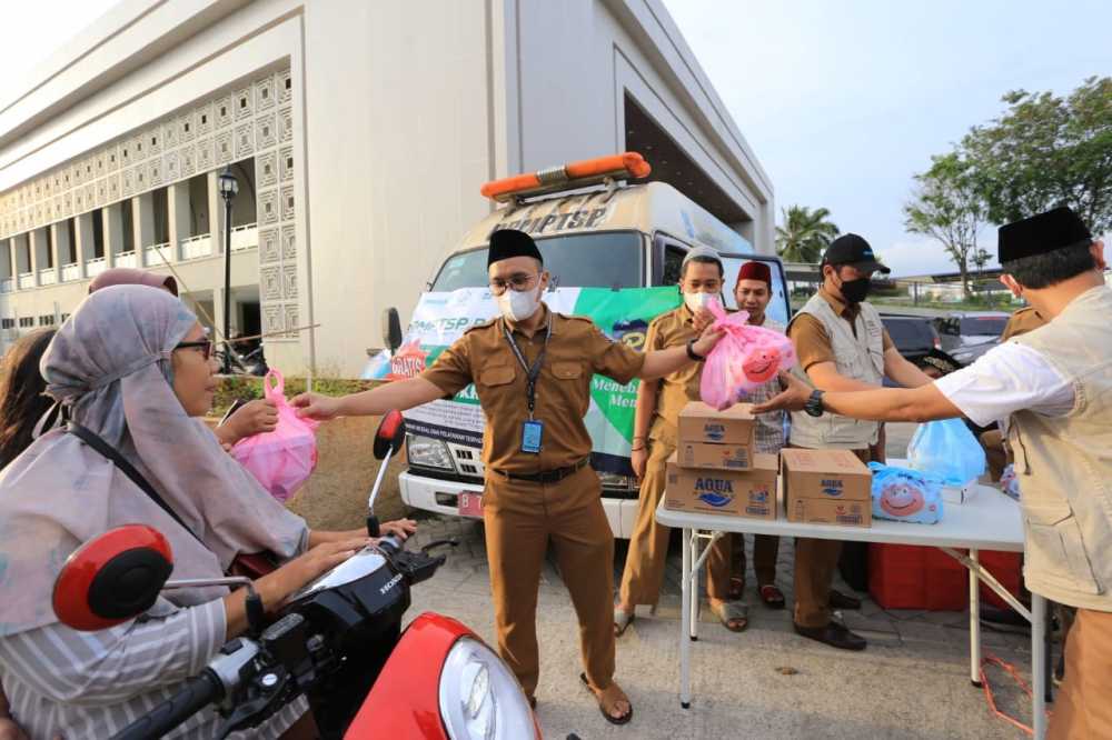 SERPONG-Dinas Penanaman Modal dan Pelayanan Terpadu Satu Pintu (DPMPTSP) menebar kebahagiaan dengan membagikan ratusan paket makanan berbuka puasa bagi masyarakat di sekitar Islamic Center, Serpong, Kota Tangsel, Selasa (26/4).