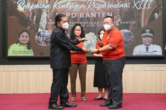 SERANG, TANGERANGEKSPRES.CO.ID – Penjabat (Pj) Gubernur Banten Al Muktabar secara resmi melepas Kontingen Pesta Paduan Suara Gerejawi (Pesparawi) Provinsi Banten di Pendopo Gubernur Banten, KP3B, Curug, Kota Serang, Rabu, 15 Juni 2022.
