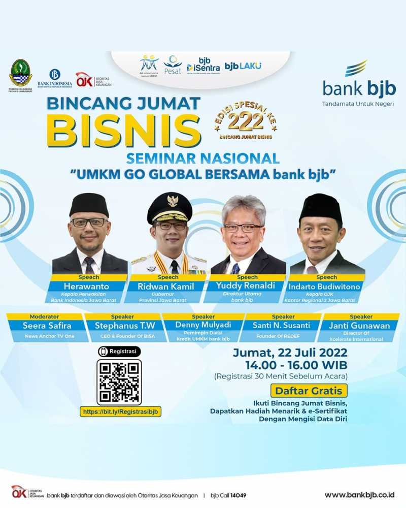 “bank bjb mengajak para pelaku bisnis khususnya UMKM untuk ikut bergabung dalam acara Bincang Jumat Bisnis spesial episode sekaligus seminar nasional UMKM Go Global Bersama bank bjb yang dihadiri pembicara keren dan para ahli bisnis ekspor,” kata Widi.