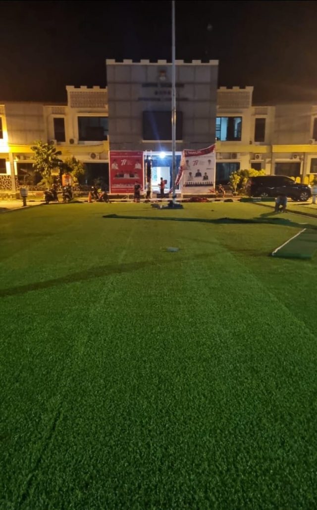 TANGERANG, TANGERANGEKSPRES.CO.ID- Lapangan upacara di Kantor Kecamatan Mauk, Kabupaten Tangerang, dipasang rumput sintetis. Pemasangan rumput tersebut dalam rangka menyongsong sejumlah acara besar di kecamatan setempat.