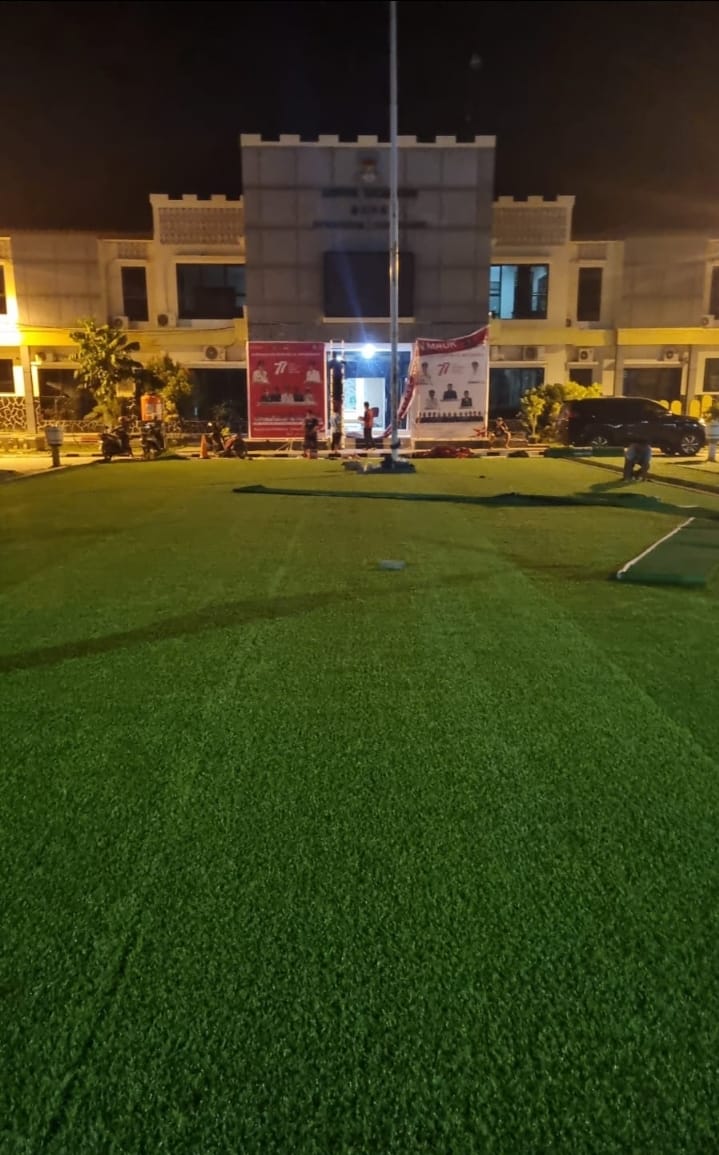 RUMPUT SINTETIS: Lapangan upacara Kantor Kecamatan Mauk dipasang rumput sintetis, Minggu (17/7). FOTO: Kecamatan Mauk for Tangerang Ekspres