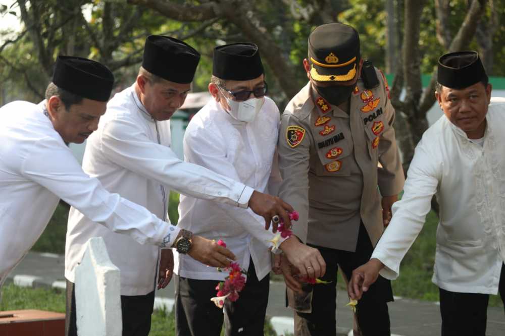 Walikota Serang Syafrudin bersama unsur Forkopimda lain menabur bunga sekaligus berziarah di Makam Pahlawan dan Makan Sultan Maulana Hasanuddin Banten, Kota Serang, Selasa, 9 Agustus 2022. FOTO PEMKOT SERANG FOR TANGERANG EKSPRES
