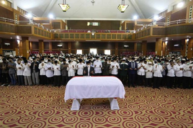 TANGERANGEKSPRES.CO.ID-Jenazah Ketua Dewan Pers dan Guru Besar UIN Jakarta Prof. Azyumardi Azra disalatkan di Auditorium Harun Nasution UIN sebelum diberangkatkan ke Taman Makam Pahlawan Kalibata, Selasa (20/9). Jenazah tiba di kampus UIN pukul 06.30 WIB dengan diiringi ratusan jamaah.