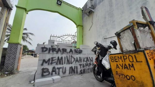 TANGERANG — Ketua Dewan Kemakmuran Masjid (DKM) Assalam, di Kampung Sukahati, Desa Karang Serang, Kecamatan Sukadiri, Kabupaten Tangerang, membatasi akses keluar masuk masjid tersebut. Pembatasan akses masuk keluar dengan memasang bata hebel di depan pintua Masjid Assalam.