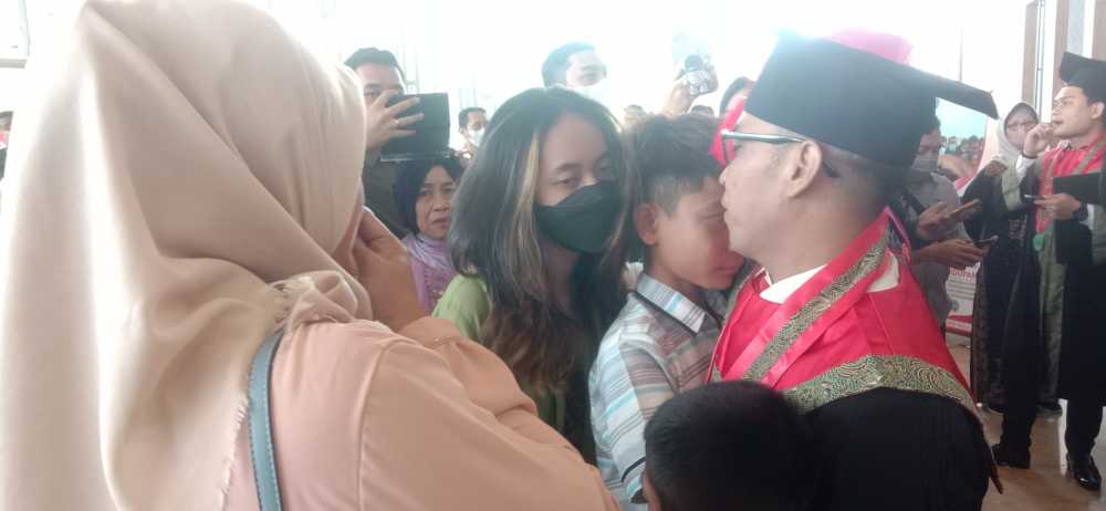 Salah satu mahasiswa warga binaan Kampus Kebidupan Lapas Pemuda Tangerang yang mengikuti prosesi wisuda bersama keluarganya terlihat haru bahagia.
