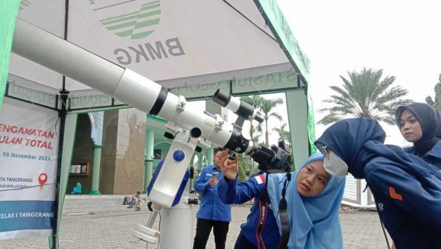 TANGERANG, tangerangekspres.co.id – Badan meteorologi klimatologi dan geofisika (BMKG) stasiun Geofisika Klas I Tangerang melakukan pengamatan gerhana bulan total di halaman masjid Al-Azhom, Kota Tangerang, Selasa (8/11).