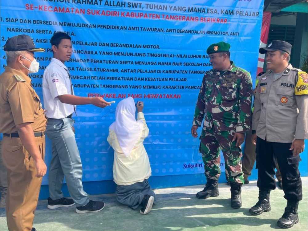 TANGERANG — Tiga pilar Kecamatan Sukadiri, bersama beberapa sekolah menggelar kampanye anti tawuran pelajar. Deklarasi dilakukan agar tidak terjadi lagi tawuran pelajar di wilayah Kecamatan Sukadiri dan wilayah lainnya.