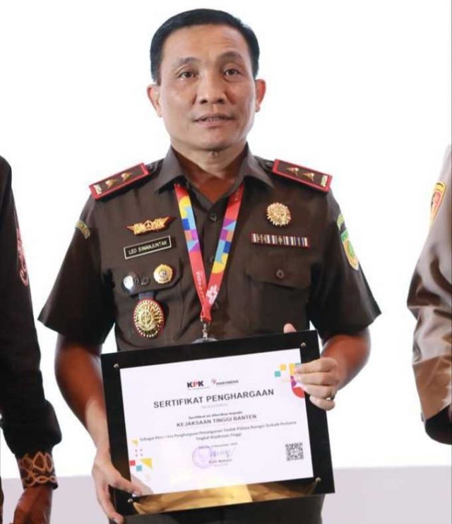 Kepala Kejaksaan Tinggi Banten Leonard Eben Ezer Simanjuntak menerima penghargaan tersebut dalam acara puncak Peringatan Hari Antikorupsi Sedunia (Hakordia) Tahun 2022 dengan tema ‘Indonesia Pulih Bersatu Berantas Korupsi’ yang dilaksanakan di Hotel Bidakara, Jakarta, Jumat (9/12/2022).