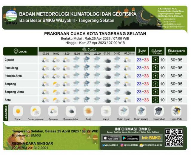 “Meskipun secara umum suhu tertinggi yang tercatat di beberapa lokasi berada pada kisaran34 derajat celcius sampai 36 derajat celcius hingga saat ini,” ujarnya dalam siaran resminya yang diterima TangerangEkspres.co.id, Rabu, 25 April 2023.