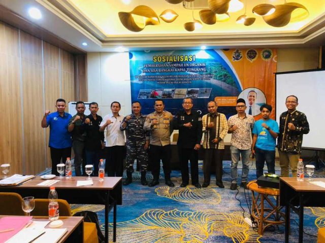 Kegiatan Sosialisasi Pembersihan Sampah Un Organik dan Sisa Bangkai Kapal Tongkang dilakukan di hotel Mutiara Carita, Kabupaten Pandeglang, Provinsi Banten, Sabtu (22/7/2023).